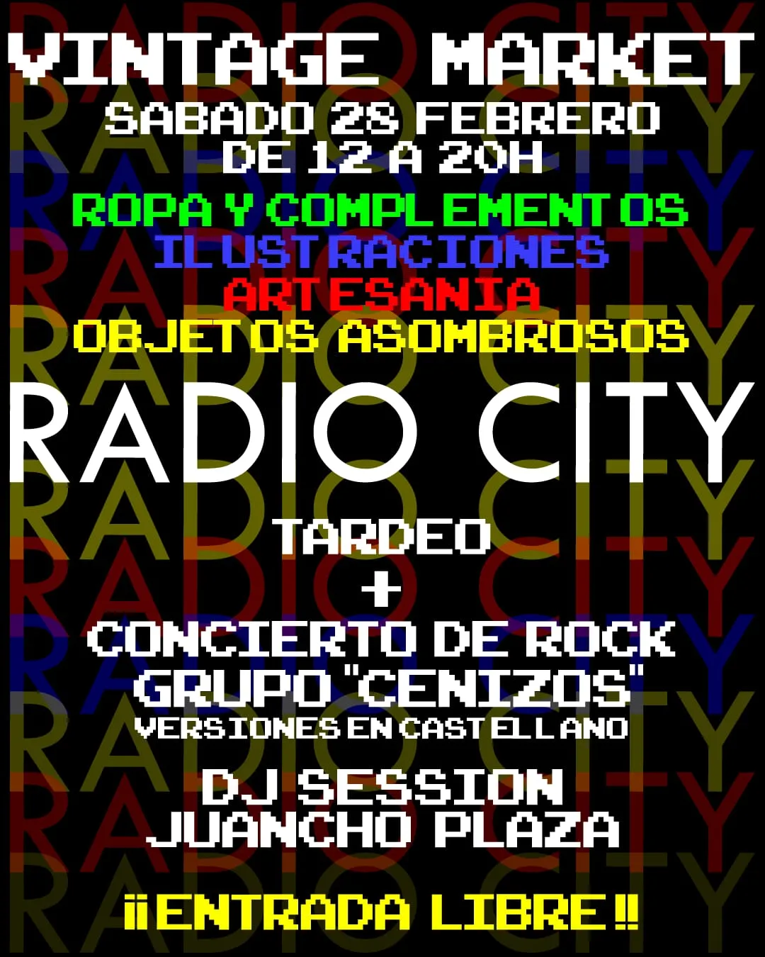 RADIO CITY VLC abre sus puertas de nuevo al Market Retro Vintage el próximo sábado 28 de febrero desde las 12:00 de la mañana hasta las 20h con un Market Retro Vintage de lo más apetecible para todos los gustos con ropa Vintage: chaquetas, chalecos, pantalones, camisetas de fútbol retro, vestidos y accesorios: gafas 60’s 70’s y 80’s, bolsos, botas y zapatillas.